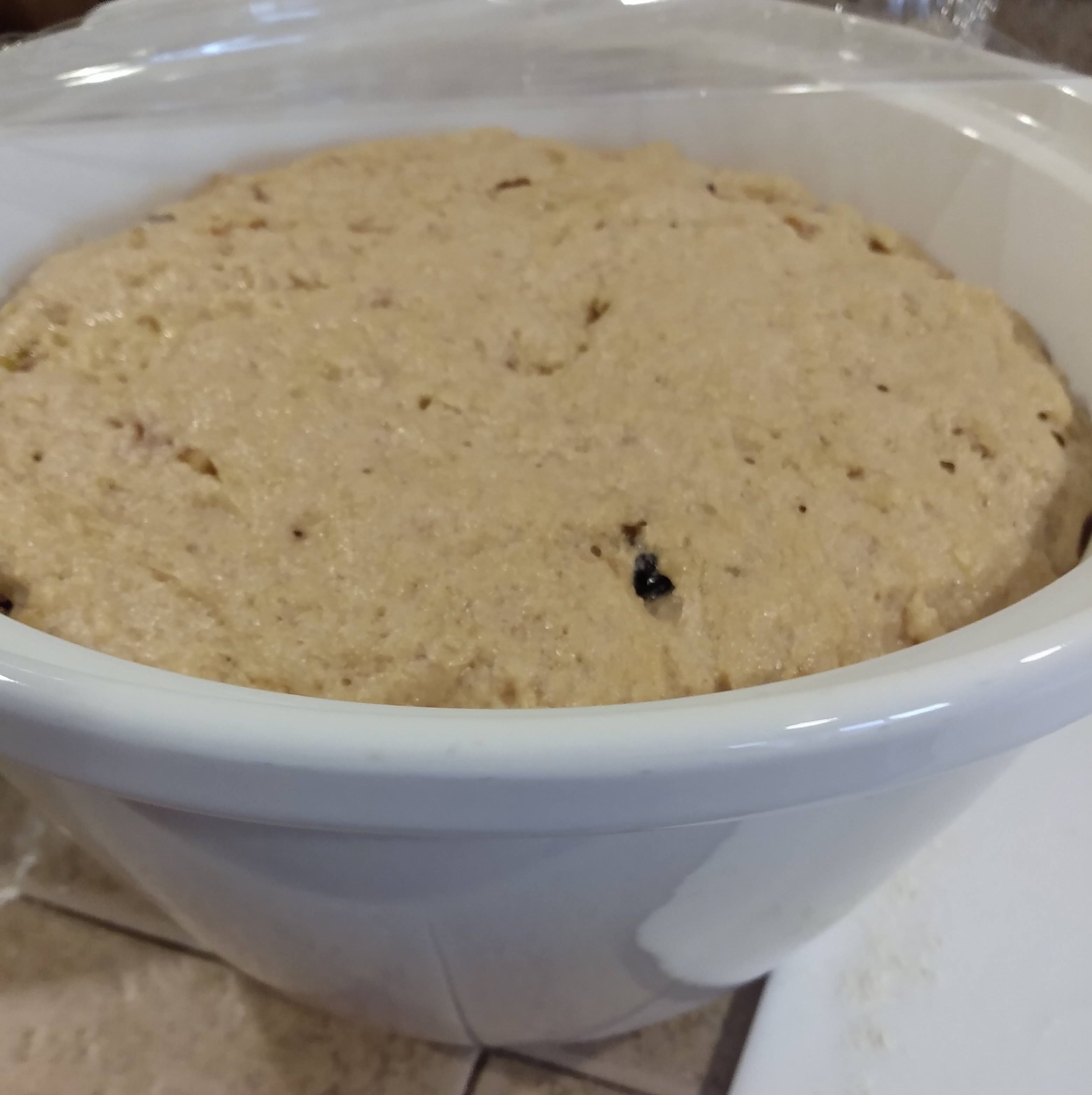 The dough will now be very sticky. Turn out onto a floured board and knead by hand for 10 minutes, adding more flour as needed to make the dough moderately stiff. (How to knead: using your palm flatten the dough somewhat by pressing down, fold the outside into the center and pushing down and away from you. Rotate and repeat, and the dough will come together to form an elastic “ball.”)